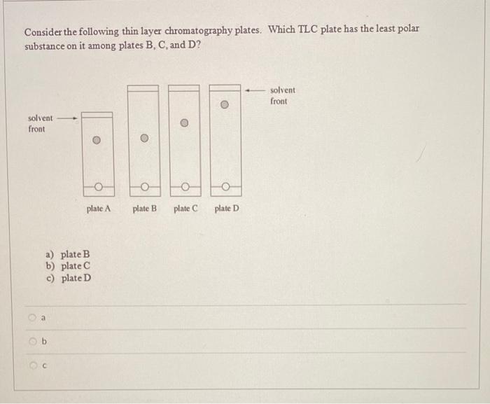[Solved] Consider the following thin layer chromatography Tlc Increase Polarity Of Solvent Explore tlc with an interactive simulator:. If a poor separation is obtained with a certain solvent, the experiment needs to be repeated with a solvent of different polarity. An increase in solvent polarity increases \(r_f\) values for two reasons: Well, a tlc plate is an aluminum plate coated by a “thin layer” of a stationary phase, which is usually (>95%. Tlc Increase Polarity Of Solvent.